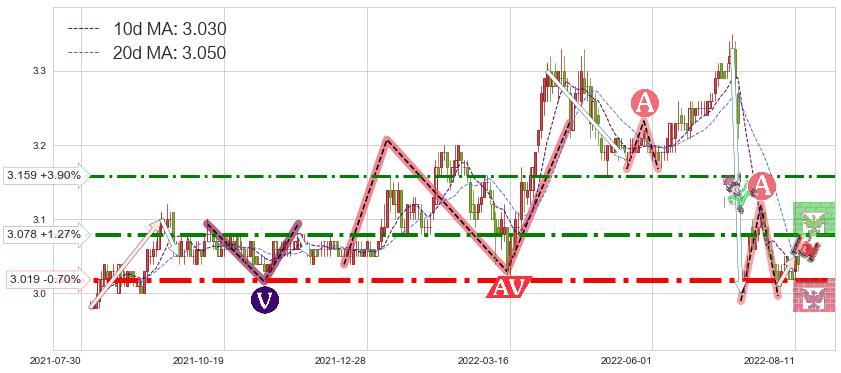 ♘ 阻力价格位3.078,可信任强度76.32%,距离最后交易2022-08-12形成的收盘价格3.040相差 +1.27%