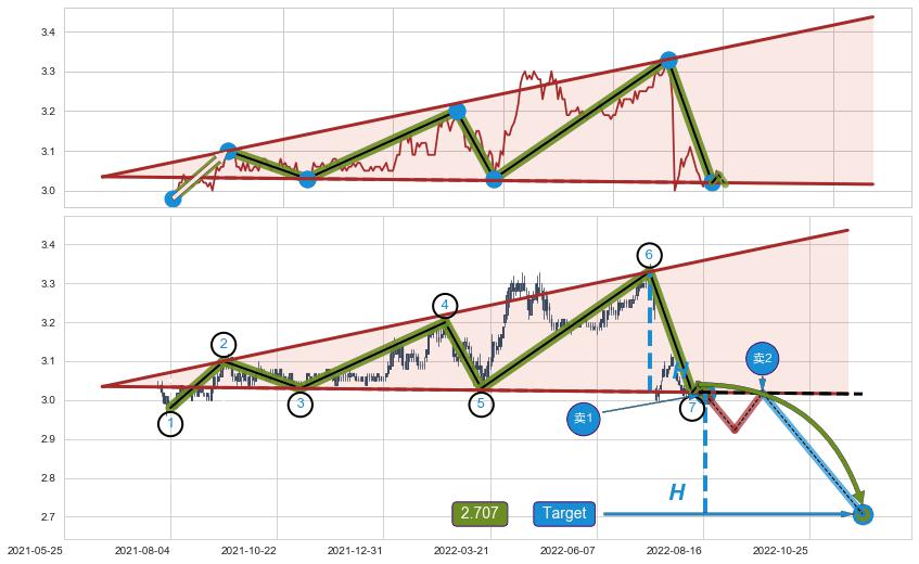 ➢ 最小反转跌幅→𝐇: 0.30891 (逐步抬高阻力斜边最后的阻力点⑥与支撑边垂直距离)