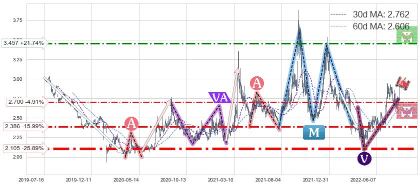 ♘ 阻力价格位3.457,可信任强度57.44%,距离最后交易2022-08-12形成的收盘价格2.840相差 +21.74%