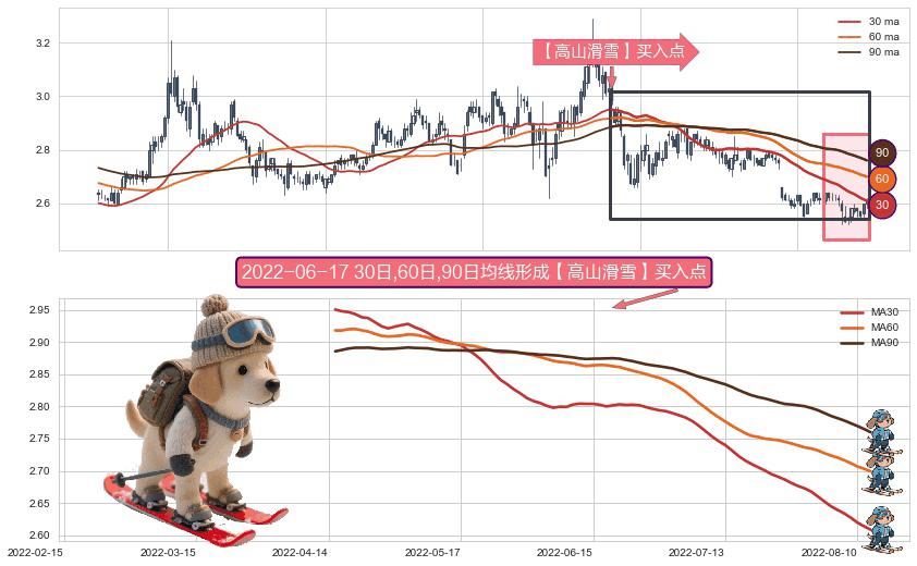 ⚀ 2022-04-15日-2022-08-12日显现 30日-60日-90日均线 【高山滑雪】买入点 看多信号,后市看涨,买入