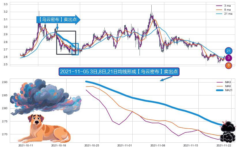 ⚀ 2021-10-21日-2021-11-19日显现 3日-8日-21日均线 【乌云密布】卖出点 看空信号,后市看跌,卖出