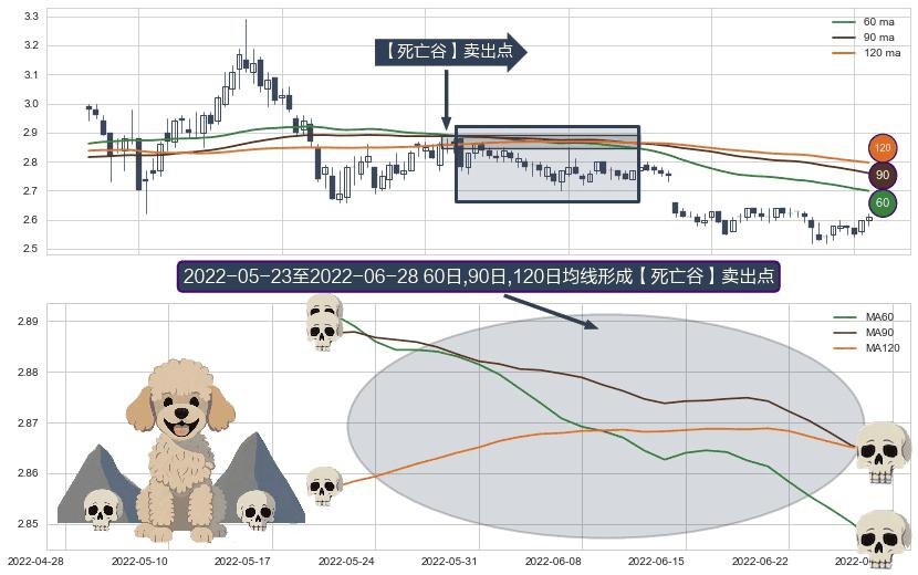 ⚀ 2022-05-24-日至2022-06-28-日显现 60日-90日-120日均线 【死亡谷】卖出点 看空信号,后市看跌,卖出