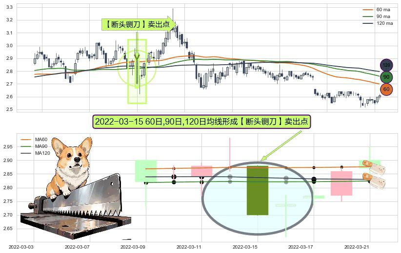 ⚀ 2022-03-15日显现 60日-90日-120日均线 【断头铡刀】卖出点 看空信号,后市看跌,卖出