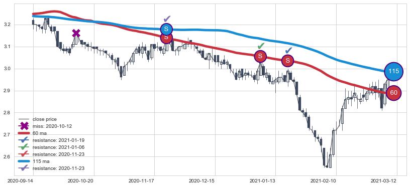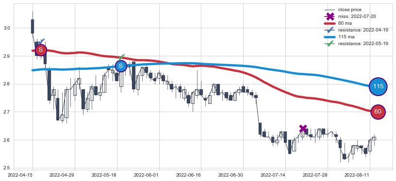 ⚃ 在破位点附近ma走势明显平稳迹象,稍后的走势中ma下垂迹象也出现,信号【可信度中等偏上】