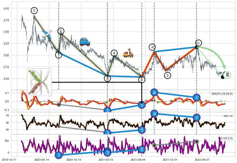 ➢ 1,3,5驱动浪MACD, RSI, KDJ走势都出现【常规背离】反转信号增强