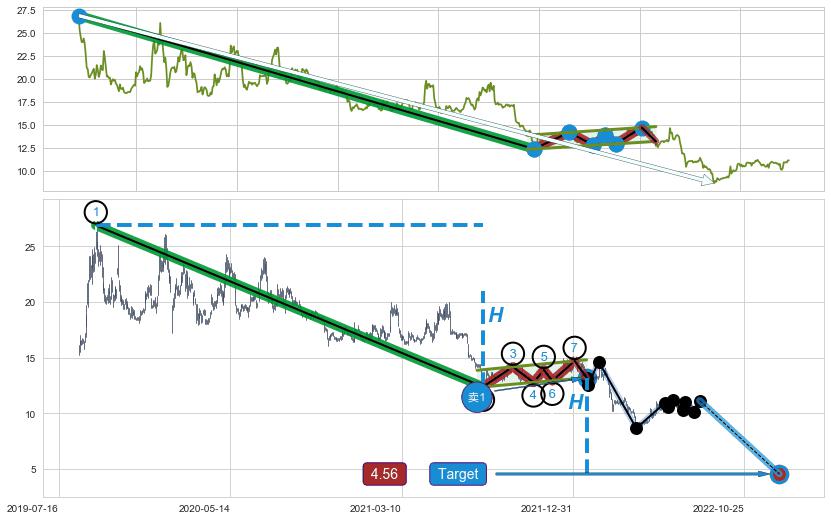 | 4 🅚:【断头铡刀】卖出点 ➕ 📐:升旗形下行突破支撑位破位, 猜想持续下沉下跌,被突破的支撑位已变为阻力位 ☞ 看空信号 ⇥ 【均线】交织【图形】⇥ 综合量化分数: 34 | > |