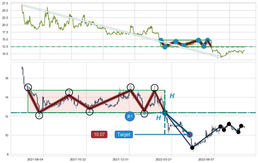➣ 收盘价(2022-07-14: 10.70 )→回踩→第一根k线低点(2022-07-08: 10.64 )