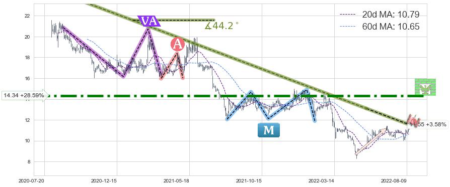 🦴 长线均值回复组合短线趋势跟踪[强阻力信号]2020-08-03-2022-05-20下跌趋势依然成立(下跌趋势跟踪依然存在),短线价格略微上行反弹(均值回复猜想),即将接近下跌趋势提供的未破位阻力价格:11.55。