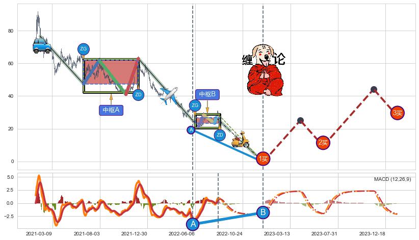 | 12 🅚:下跌两颗星 | 下跌三颗星 ➕ ☯️:缠论中枢点下降缠中枢B破位后距离1买距离较远,随后猜想后续持续下跌(趋势跟踪) ☞ 看空信号 ⇥ 【🅚线】交织【图形】⇥ 综合量化分数: 49 | > |