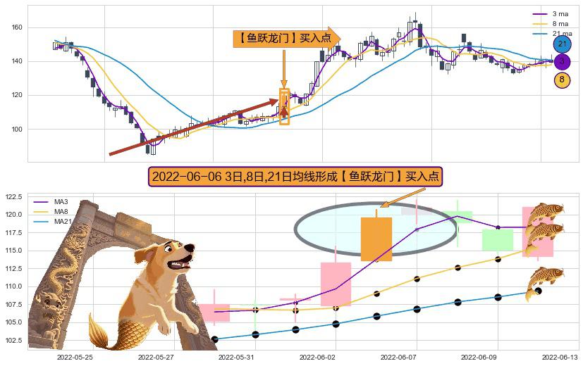 形态多维评估: ⚀ 2022-06-06日显现 3日-8日-21日均线 【鱼跃龙门】买入点 看多信号,后市看涨,买入