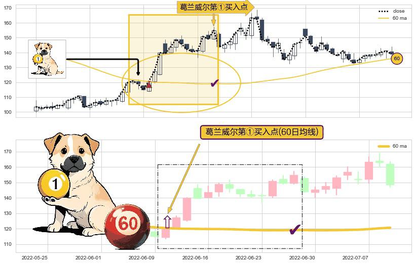 形态多维评估: ⚀ 2022-06-10-日显现 葛兰威尔均线 60日均线 第买①入点 走势反转见底信号,后市看涨,买进信号