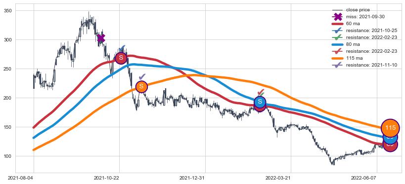 下跌趋势2021-08-04-2022-06-13,均线80, 115, 60确认关键阻力3处