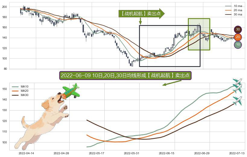 形态多维评估: ⚀ 2022-05-10日-2022-07-08日显现 10日-20日-30日均线 【战机起航】卖出点 看空信号,后市看跌,卖出