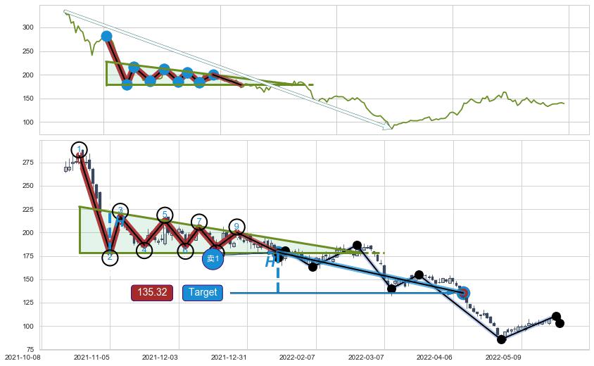 ➢ 【多方力量耗尽,空方打破攻守平衡点】下降三角形中继整理, 已在2022-01-14突破【支撑】颈线 178.78 →演变成下降通道