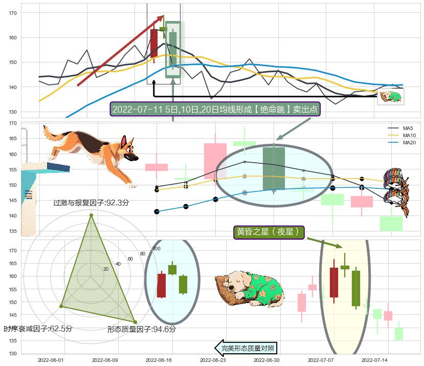 | 4 🅚:【绝命跳】卖出点 ➕ 🌊:波浪理论下跌5浪延续:猜想C点强阻力小反弹终止,猜想保持下跌5浪方向下行(均值回复后大周期继续趋势跟踪) ☞ 看空信号 ⇥ 【均线】交织【图形】⇥ 综合量化分数: 44 | > |
