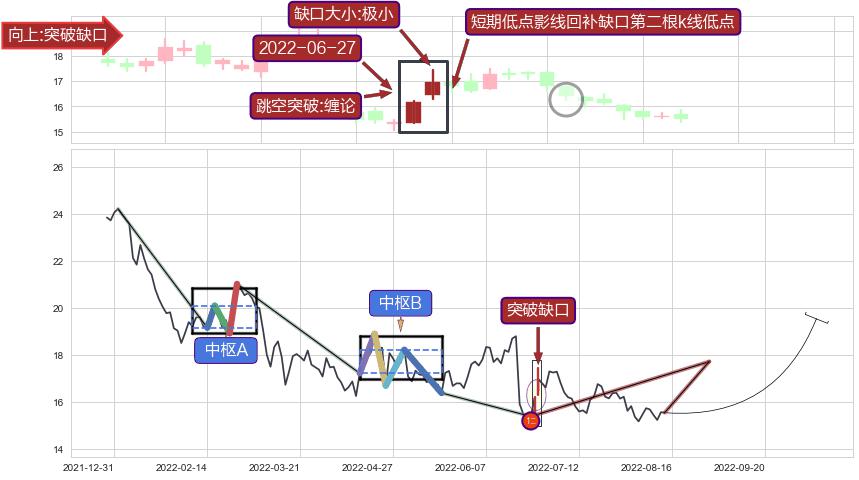 ➢ 低点影线(2022-07-06: 16.27 )→回踩→第二根k线低点(2022-06-27: 16.28 )