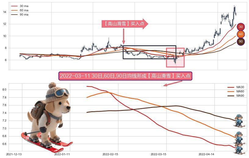 形态多维评估: ⚀ 2022-01-20日-2022-04-27日显现 30日-60日-90日均线 【高山滑雪】买入点 看多信号,后市看涨,买入