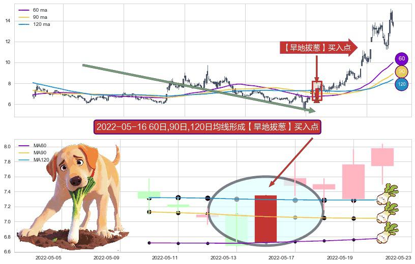 形态多维评估: ⚀ 2022-05-16日显现 60日-90日-120日均线 【旱地拔葱】买入点 看多信号,后市看涨,买入