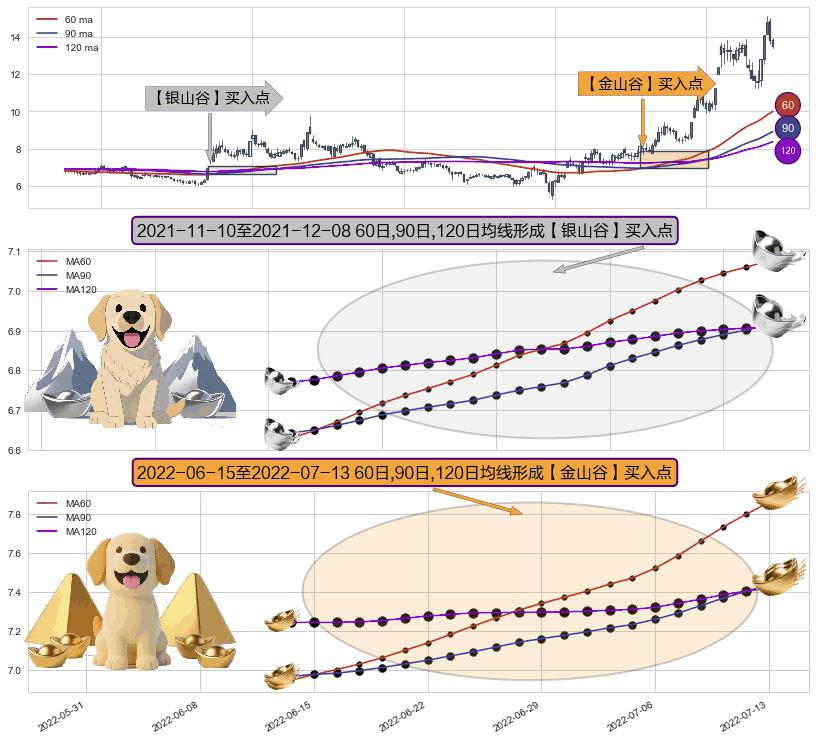 形态多维评估: ⚀ 2022-06-16-日至2022-07-13-日显现 60日-90日-120日均线 【金山谷】买入点 其再次确认了买入信号,可靠性更强,买入