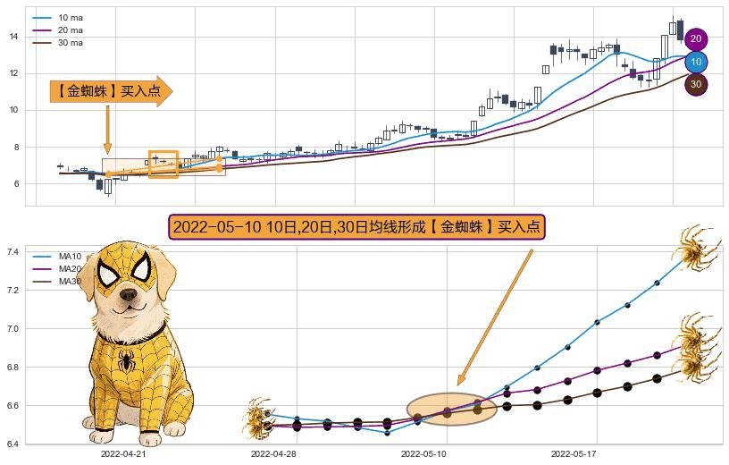 形态多维评估: ⚀ 2022-05-10日显现 10日-20日-30日均线 【金蜘蛛】买入点 看多信号,后市看涨,买入
