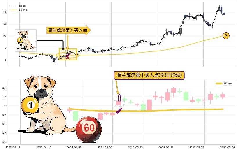 形态多维评估: ⚀ 2022-05-09-日显现 葛兰威尔均线 60日均线 第买①入点 走势反转见底信号,后市看涨,买进信号