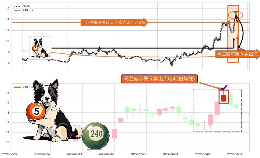 形态多维评估: ⚀ 2022-08-10-日显现 葛兰威尔均线 240日均线 第⑤卖出点 上升趋势均值回复的短线回落信号,后市看跌,卖出信号