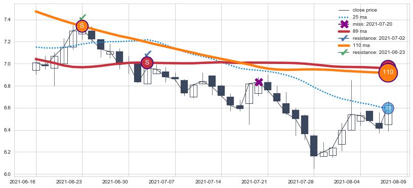 下跌趋势2021-06-16-2021-08-09,均线89, 110确认关键阻力2处