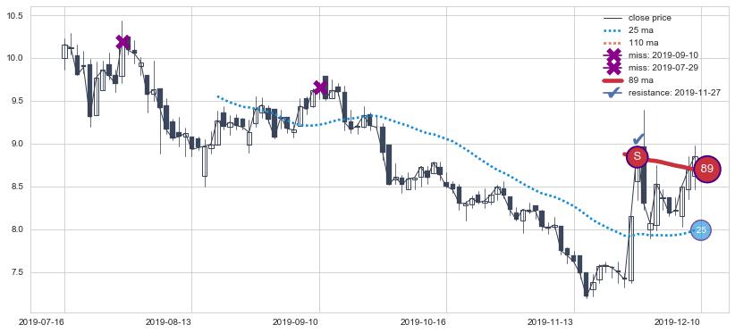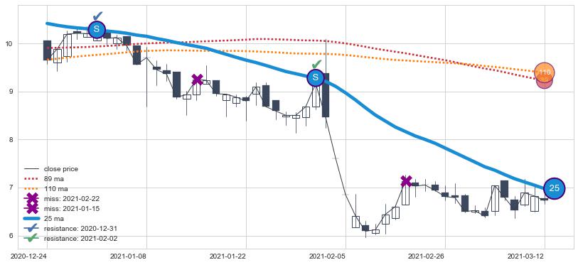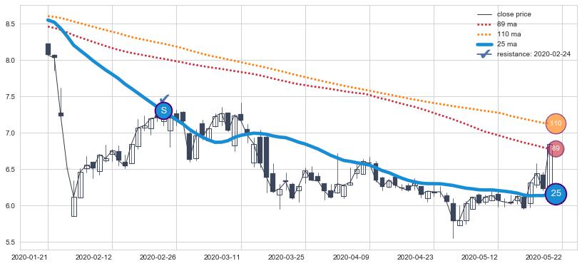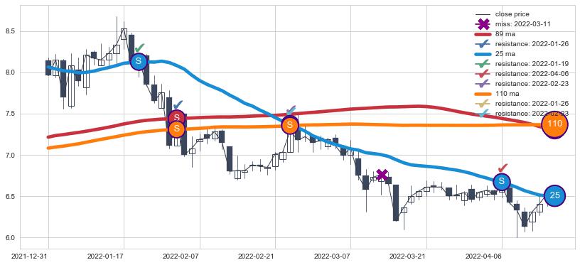 下跌趋势2021-12-31-2022-04-14,均线89, 110, 25确认关键阻力4处