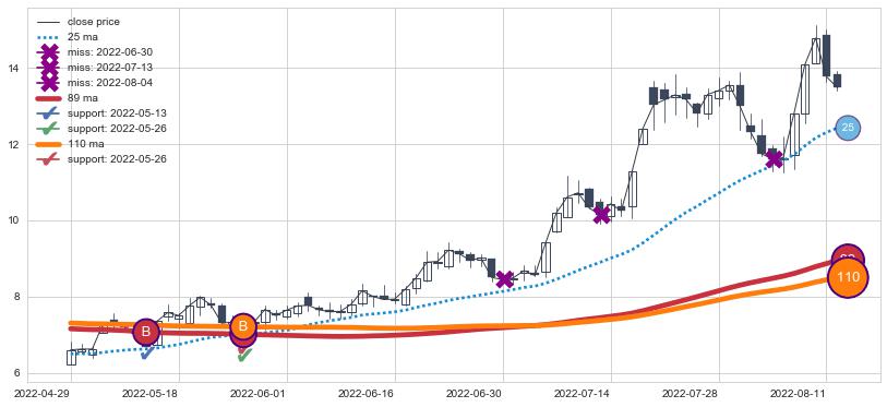 上涨趋势2022-04-29-2022-08-12,均线89, 110确认关键支撑2处