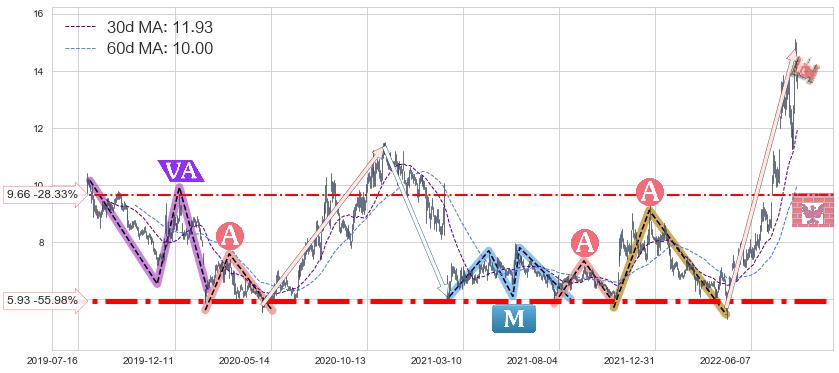 ♘ 支撑价格位9.66,可信任强度44.77%,距离最后交易2022-08-12形成的收盘价格13.48相差 -28.33%