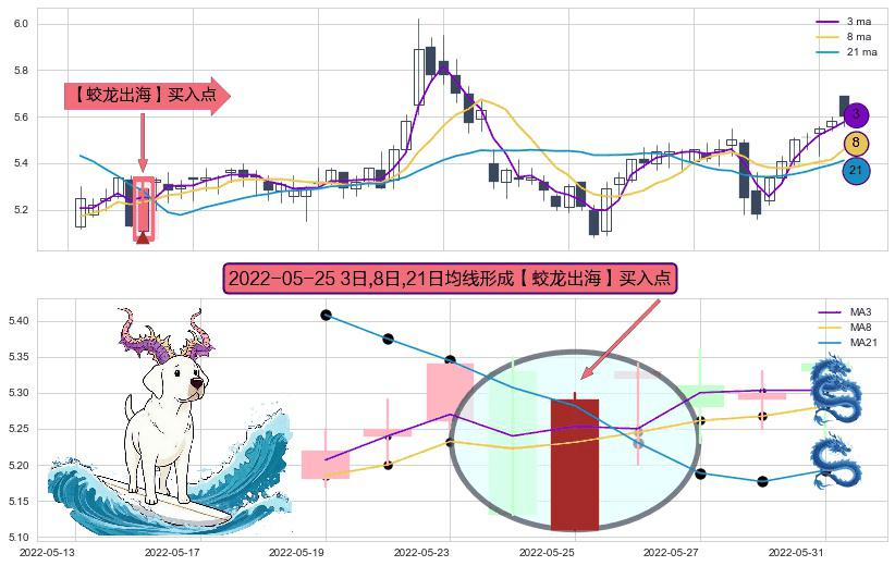 形态多维评估: ⚀ 2022-05-25日显现 3日-8日-21日均线 【蛟龙出海】买入点 看多信号,后市看涨,买入