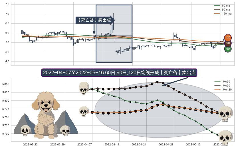 形态多维评估: ⚀ 2022-04-08-日至2022-05-16-日显现 60日-90日-120日均线 【死亡谷】卖出点 看空信号,后市看跌,卖出