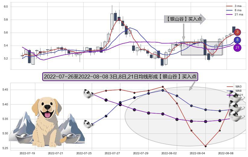 形态多维评估: ⚀ 2022-07-27-日至2022-08-08-日显现 3日-8日-21日均线 【银山谷】买入点 看多信号,后市看涨,买入
