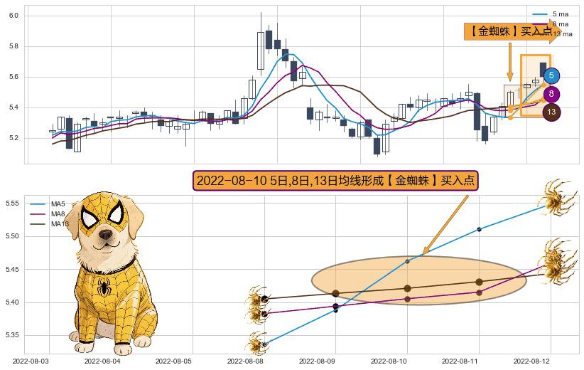 形态多维评估: ⚀ 2022-08-10日显现 5日-8日-13日均线 【金蜘蛛】买入点 看多信号,后市看涨,买入