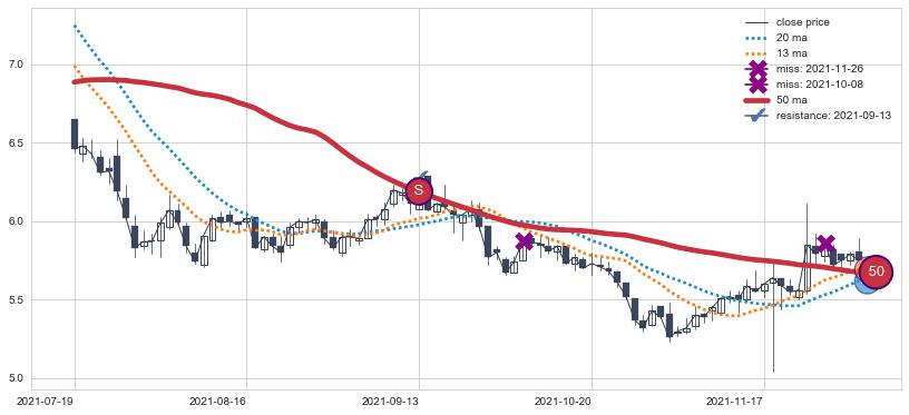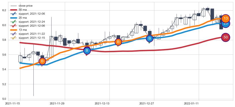 上涨趋势2021-11-15-2022-01-18,均线50, 20, 13确认关键支撑4处