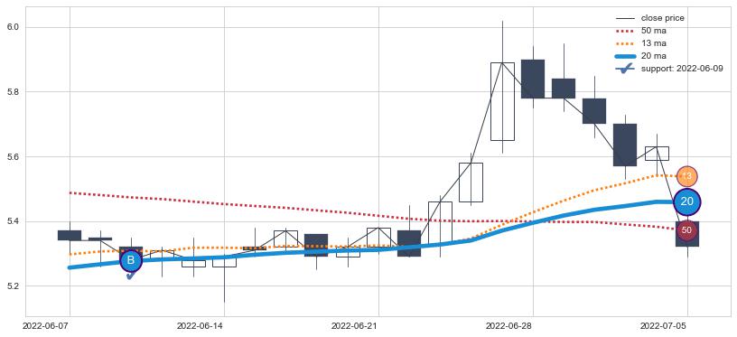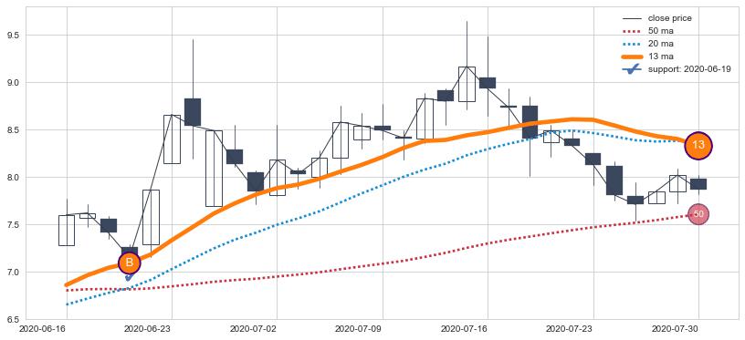 上涨趋势2020-06-16-2020-07-30,均线13确认关键支撑1处