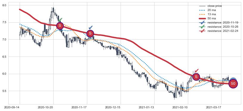 下跌趋势2020-09-14-2021-03-24,均线50确认关键阻力3处