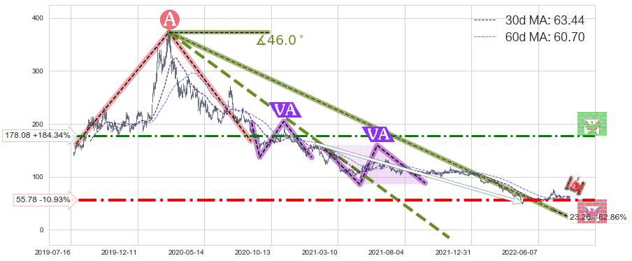 从2020-02-25至2022-07-07,共包含576个交易日,阶段股价下跌-142.45%,阶段股价变动位移路程比: 1 : 8,下跌趋势角度: 46.0