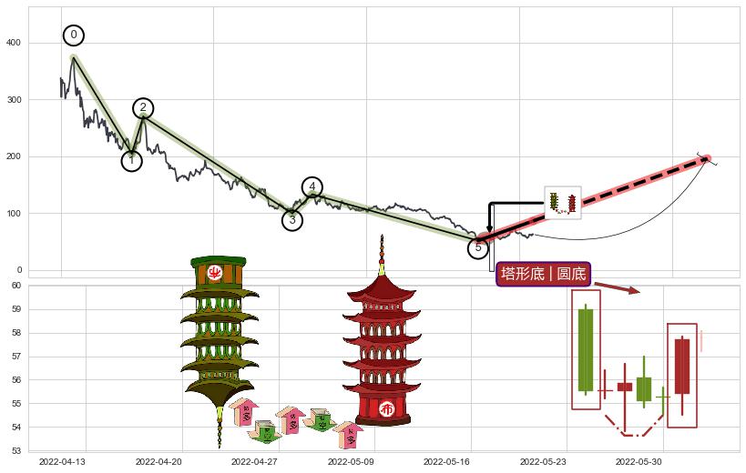 ➣ 收盘价(2022-05-05: 57.00 )→回踩→第一根k线低点(2022-04-26: 55.60 )