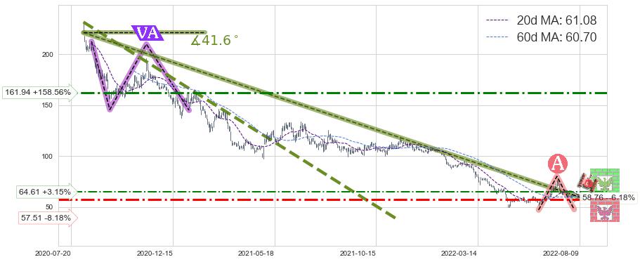 ♘ 在最后的下跌阶段2020-08-05至2022-07-05,存在 破位边缘的阻力位 ,阻力价格58.76,可信任强度82.00%,其距离最后价格62.63相差 -6.18%
