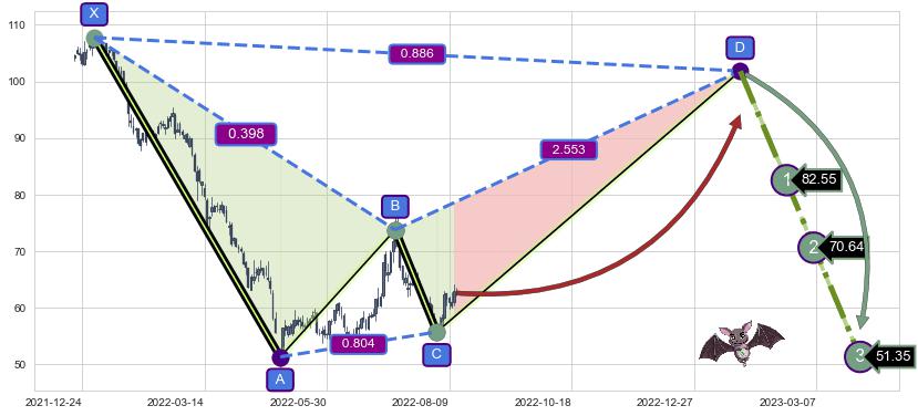 ➣ 未完成【蝙蝠】形态起点X: 2021-12-31, 已到达C点: 2022-08-02, 预测最终D点: 2023-01-23, 共264交易日