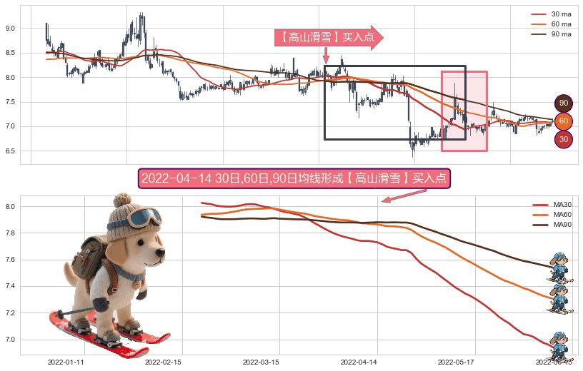 ⚀ 2022-02-21日-2022-06-09日显现 30日-60日-90日均线 【高山滑雪】买入点 看多信号,后市看涨,买入