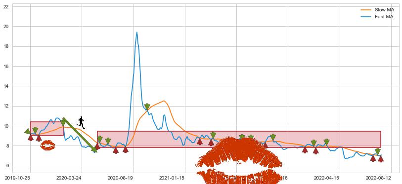 ⚅ 卖点向下突破均线后,价格走势很纠结,不断在均线周围试探,有再次上探突破均线的可能