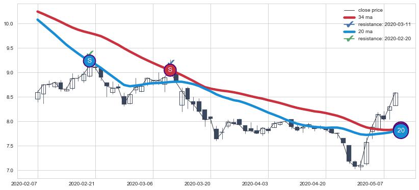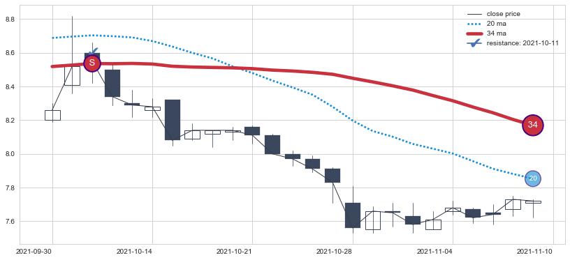 ⚄ 价格在均线遇到阻力后再次向下回落了【较短】距离, 第⑦卖出点 阻力效果【仍需验证】