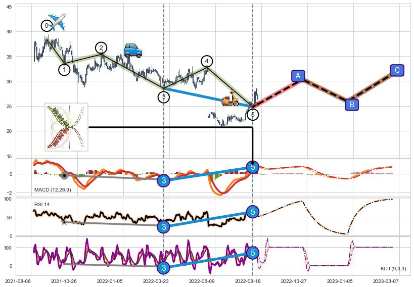 ➣ 1,3,5驱动浪MACD, RSI, KDJ走势都出现【常规背离】反转信号增强