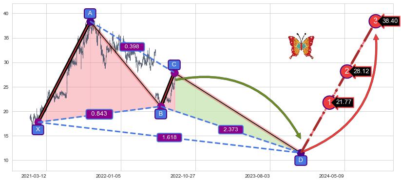 ➣ 未完成【蝴蝶】形态起点X: 2021-02-02, 已到达C点: 2022-08-09, 预测最终D点: 2023-11-28, 共707交易日