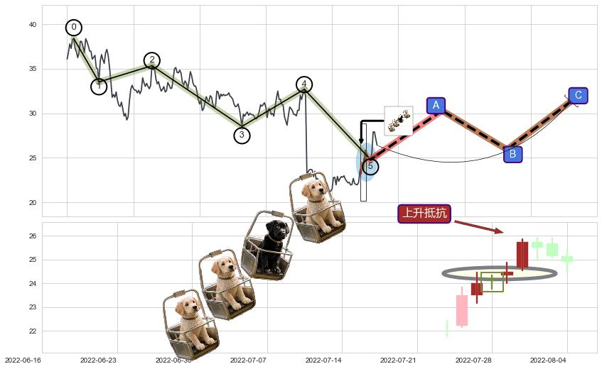 | 6 🅚:【高山滑雪】买入点 ➕ 🌊:波浪理论猜想下跌浪5已形成,猜想后续形成abc反弹上涨(均值回复) ☞ 看多信号 ⇥ 【均线】交织【图形】⇥ 综合量化分数: 52 | > |