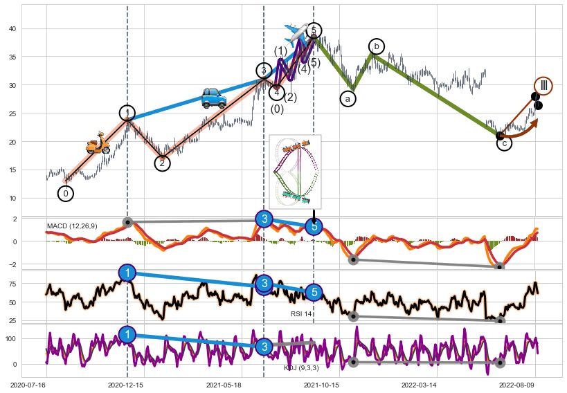➢ 1,3,5驱动浪MACD, RSI, KDJ走势都出现【常规背离】反转信号增强