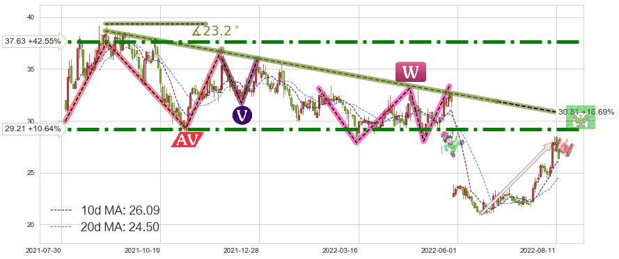 ♘ 阻力价格位29.21,可信任强度88.18%,距离最后交易2022-08-12形成的收盘价格26.40相差 +10.64%