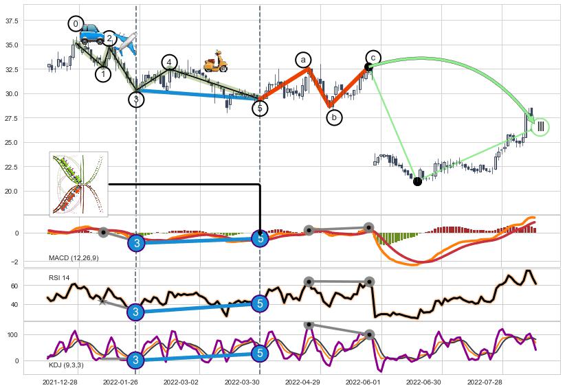 ➢ 1,3,5驱动浪MACD, RSI, KDJ走势都出现【常规背离】反转信号增强